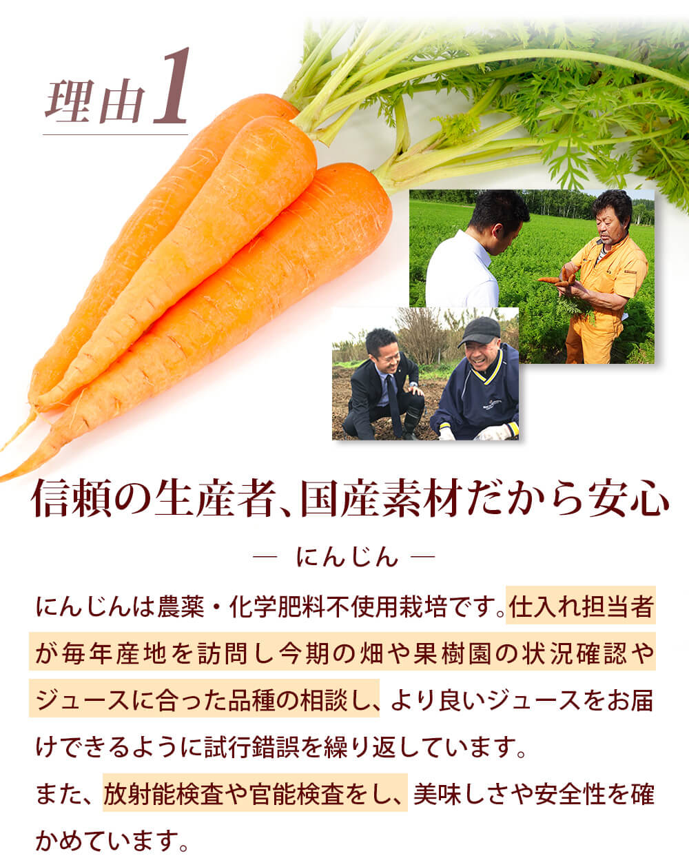 | 原材料名 | にんじん(農薬・化学肥料不使用栽培) 国産りんご(長野県産/青森県産・特別栽培) 国産レモン(佐賀県産・特別栽培) |