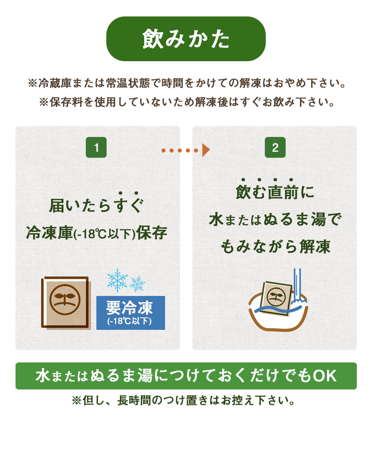 | 飲み方 | 流水またはぬるま湯で、解凍するだけ。 柔らかくなってきたら直接手で揉んで頂くとかんたんに解凍されますので、すぐ召し上がって下さい。 そのまま飲むだけではなく豆乳やはちみつなどとミキサーに入れて混ぜて朝食や昼食などに最適な濃厚手作りスムージーとしてもお楽しみいただけます |